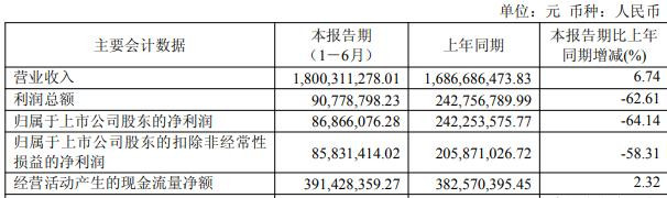 据公司2025年半年度报告,报告期内,公司实现营业收入18.00亿元,同比增长6.74%;归属于上市公司股东的净利润8686.61万元,同比减少64.14%;扣除非经常性损益后的净利润8583.14万元,同比减少58.31%;经营活动产生的现金流量净额3.91亿元。